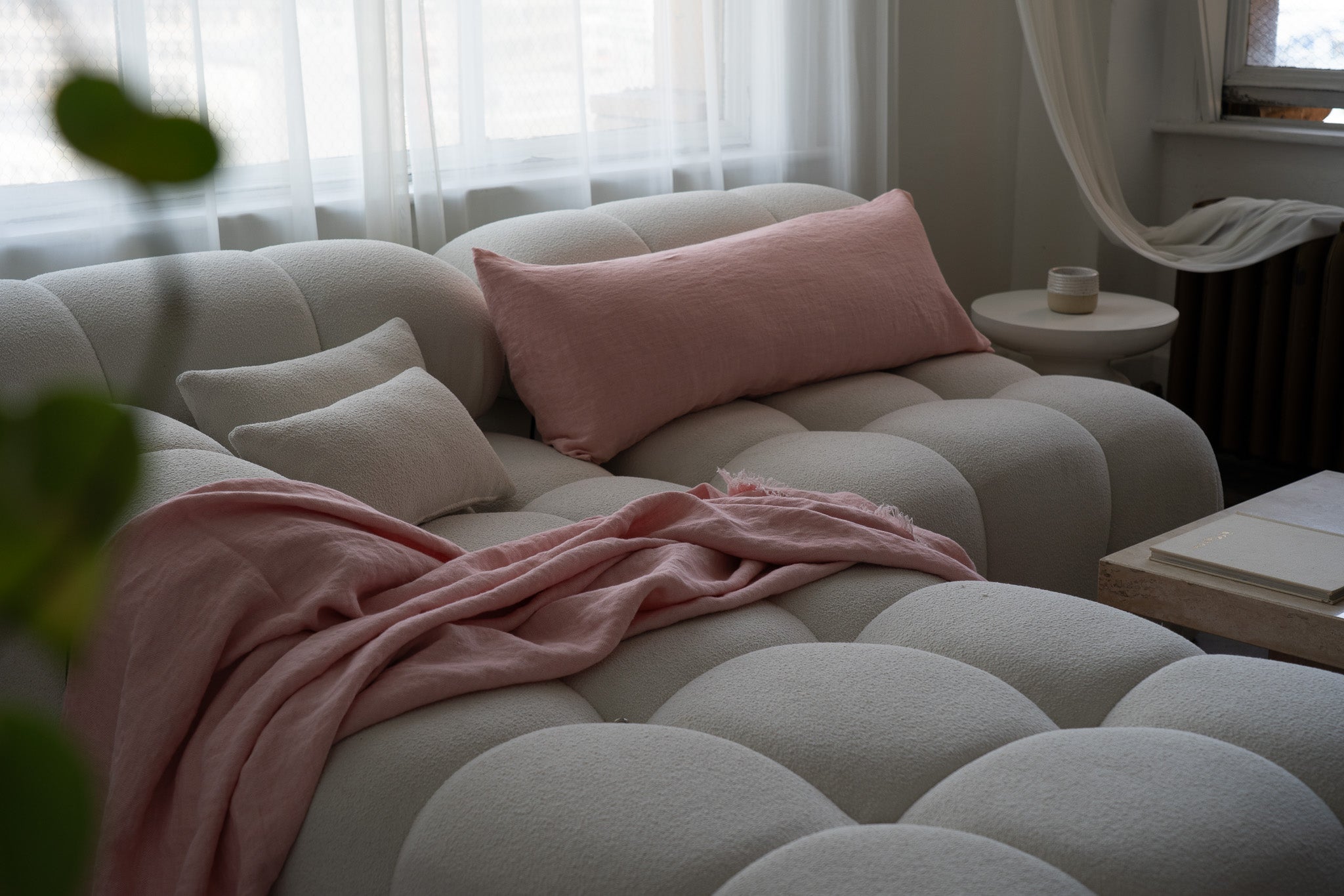 Smaller than the bedspread but equally luxurious, it's perfect for draping over a chair, at the foot of the bed, or around your shoulders on cooler days. Pair it with matching linen bolster cushions.